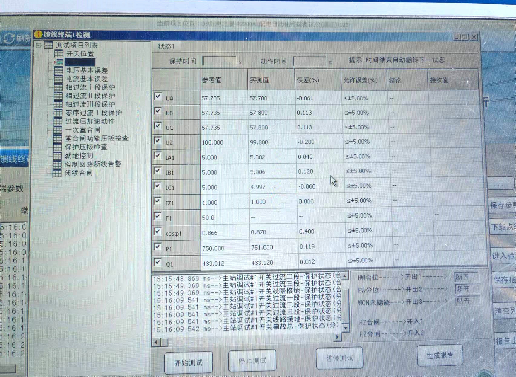 完成配置參數(shù)和接線檢查,點(diǎn)擊開(kāi)始測(cè)試,調(diào)試人員根據(jù)提示設(shè)置,進(jìn)行壓板投退操作,測(cè)試完成會(huì)彈出保存“生成報(bào)告”,自動(dòng)生成檢測(cè)報(bào)告。