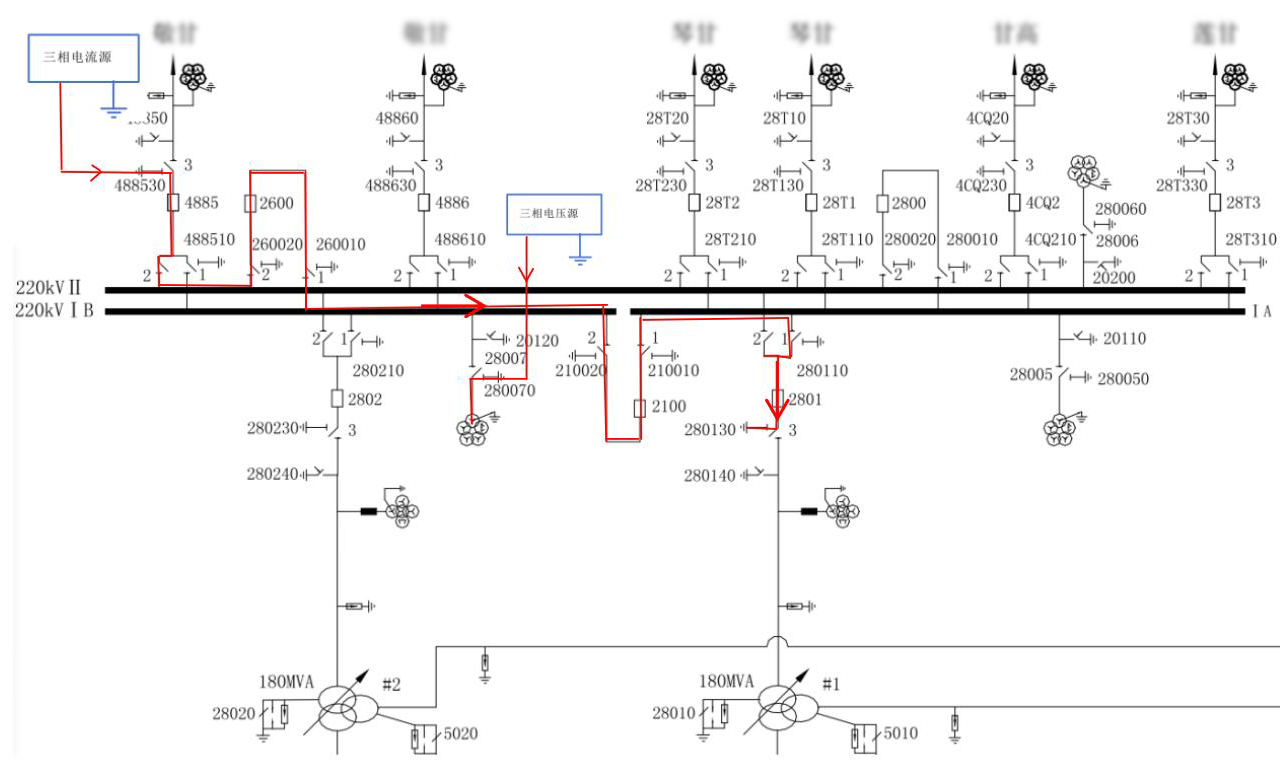 拆除220kV 4885線路間隔接地閘刀(488530閘刀)的接地連接點(diǎn),試驗(yàn)前需要斷開其它電流流經(jīng)回路的接地連接點(diǎn),保證只有220kV #1主變間隔接地閘刀(280130閘刀)的一個接地連接點(diǎn),從拆除點(diǎn)位置(488530閘刀)引線處將試驗(yàn)線纜依次與三相電流源的A、B、C輸出端子連接,電流源的N線與接地銅排連接。 (上圖中紅線即為三相電流回路流向,開關(guān)、閘刀狀態(tài)如圖)。 488530、4885、48852、26002、2600、26001、21002、2100、21001、28011、280130在合閘位置,與220kV母線連接的隔刀均斷開,其余刀閘及地刀均在分閘位置。
