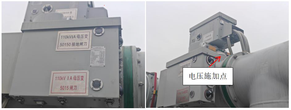 拆除110kVⅠ母A段壓變間隔接地閘刀(50150閘刀)的接地連接點(diǎn),將電壓源輸出端子分別與Ⅰ母A段壓變電壓施加點(diǎn)連接,按A、B、C接地依次接入到對應(yīng)端子,上圖紅線即為三相電壓回路接線,開關(guān)、閘刀狀態(tài)如圖,斷開刀閘50150。 (短接智能終端5015輔助接點(diǎn),使保護(hù)裝置能采到母線電壓)。 50150在合閘位置,5015在分閘位置。