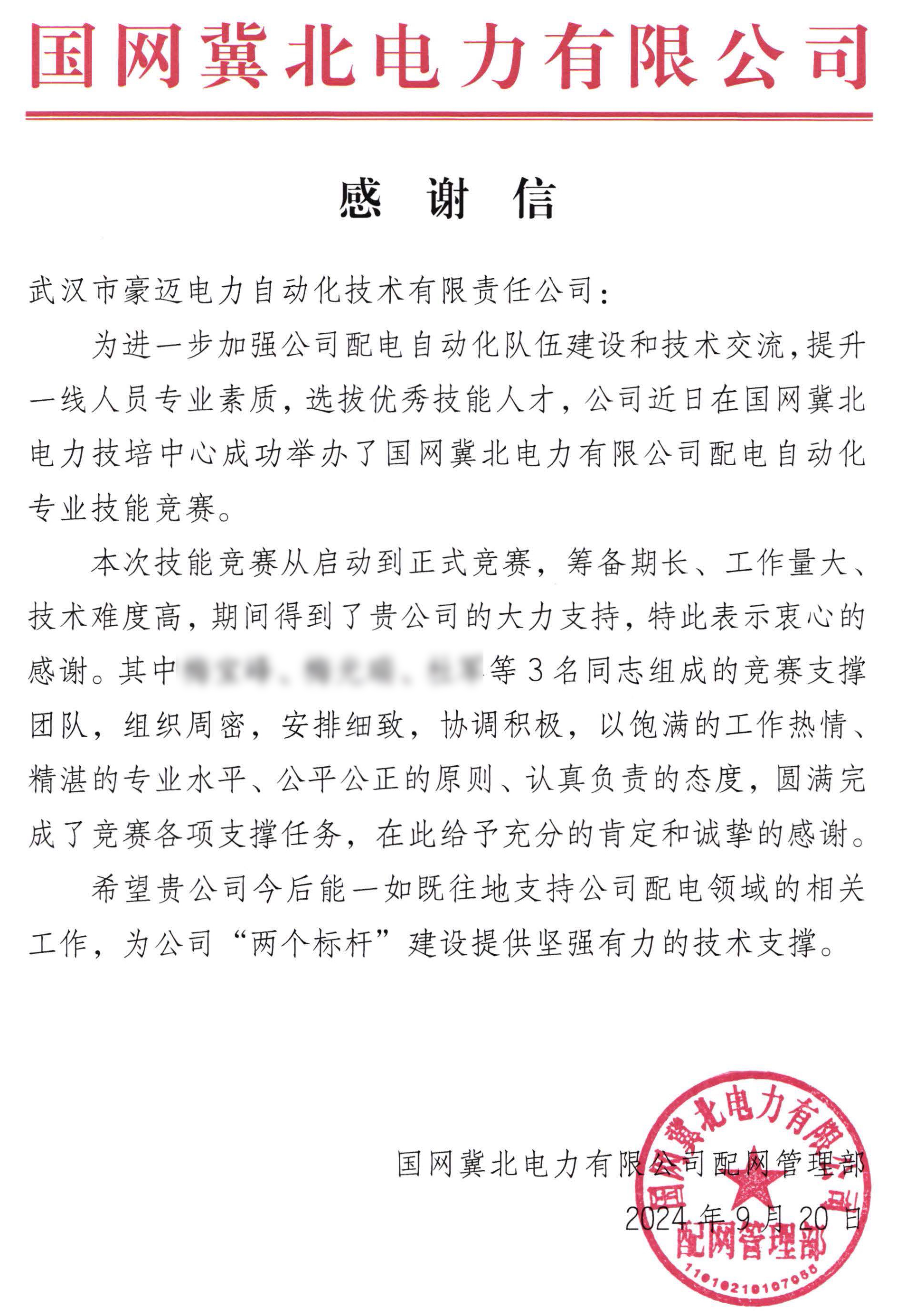 近日,武漢豪邁收到國網(wǎng)冀北電力發(fā)來的感謝信,信中對武漢豪邁安排員工“組成競賽支撐團隊,組織周密,安排細致,協(xié)調(diào)積極,以飽滿的工作熱情,精湛的專業(yè)水平、公平公正的原則、認真負責(zé)的態(tài)度,圓滿完成了競賽各項支撐任務(wù),給予充分的肯定和誠摯的感謝”。字里行間蘊藏著客戶對我司產(chǎn)品品質(zhì)、技術(shù)實力、服務(wù)能力的高度認可與滿滿信任,既是榮譽,也是鞭策,更是動力。