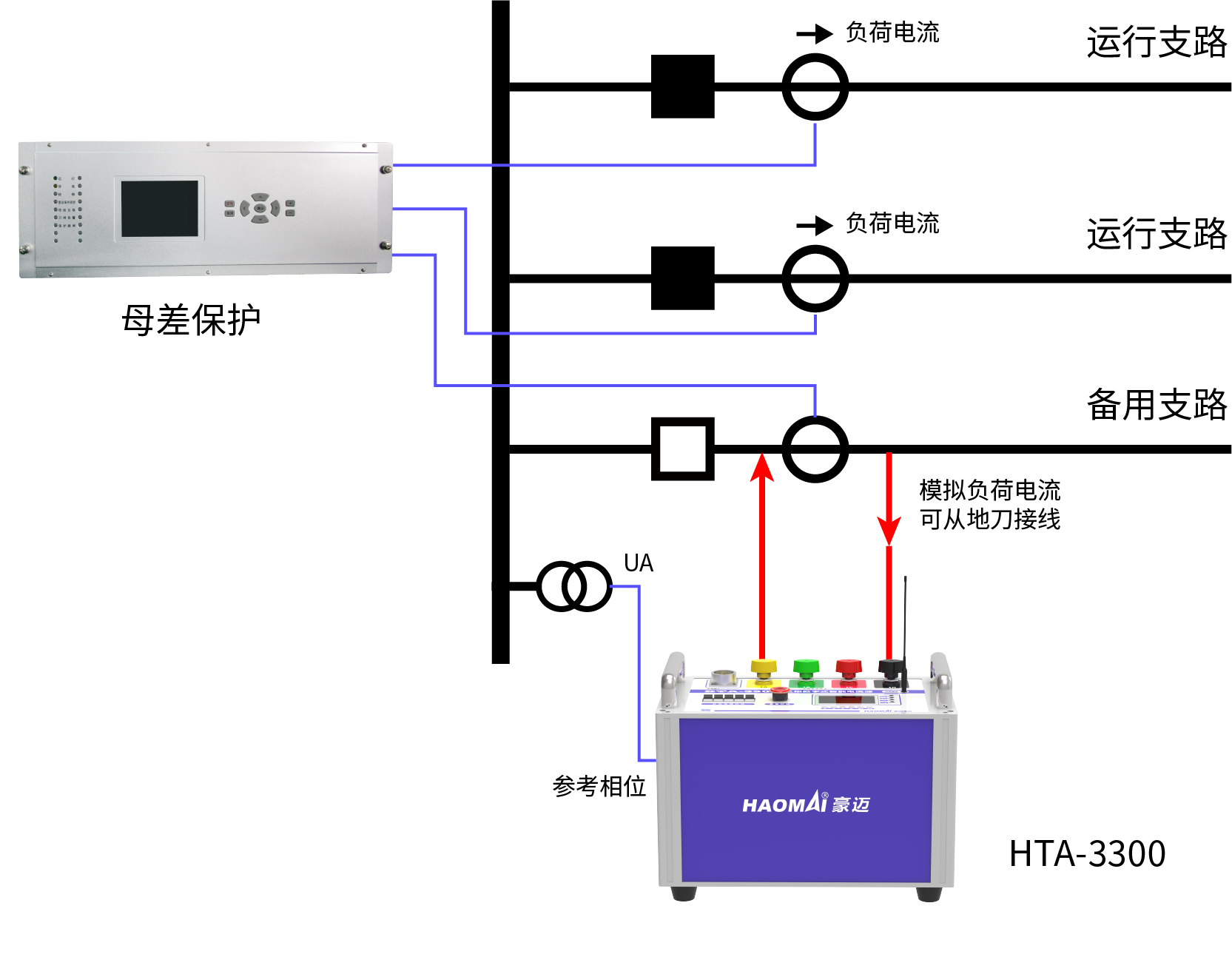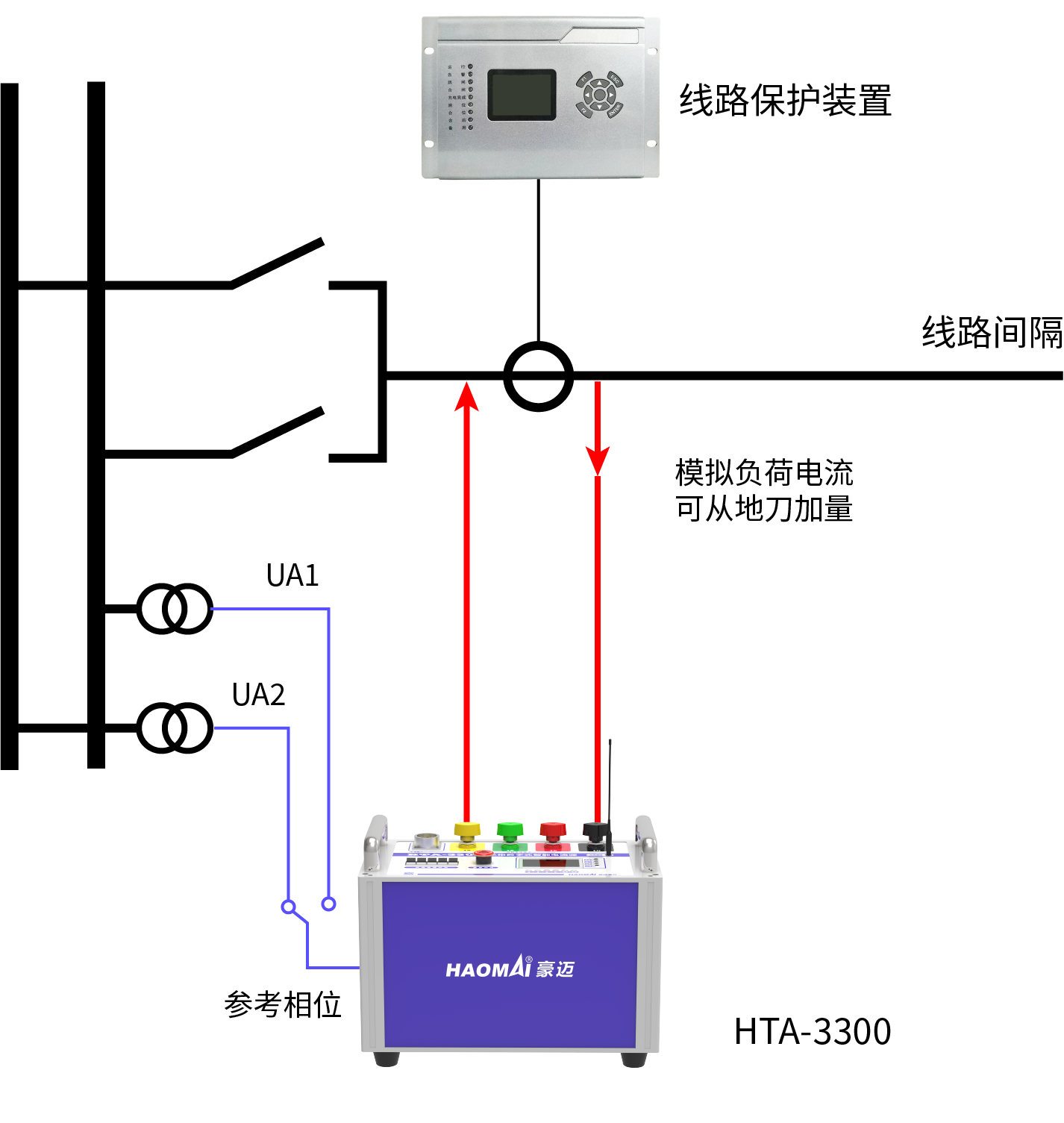 雙母線系統(tǒng)線路間隔停電更換保護,可以采用HTA-3300 三相數(shù)字式智能大電流源輸出0-300A電流加到CT一次側,該電流分別與兩段母線PT的二次運行電壓UA1、UA2同步,模擬線路間隔分別接入兩段母線時的負荷電流,用于對該間隔的二次回路的向量檢查, 也可模擬輸出零序電流用于檢查N線。