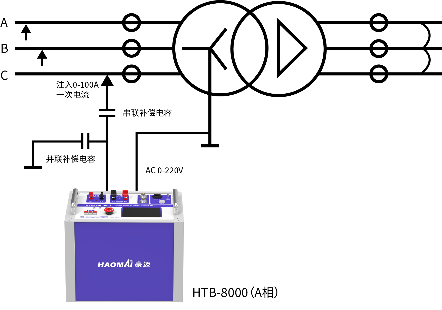 HTB-8000 通過串聯(lián)電容補償來抵消變壓器的激磁感抗,采用380V/220V電源從變壓器中壓(或高壓)Y側一次繞組(CT外側)注入100A電流,其他側分別短接(CT外側),變壓器各側一次繞組均有電流流過CT,CT二次回路所產(chǎn)生的電流即可用于對變壓器保護進行向量檢查。