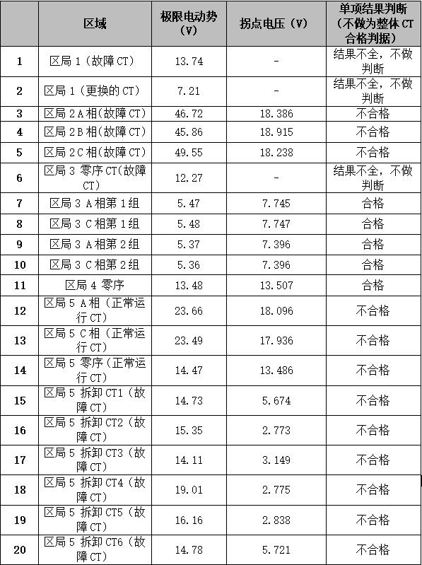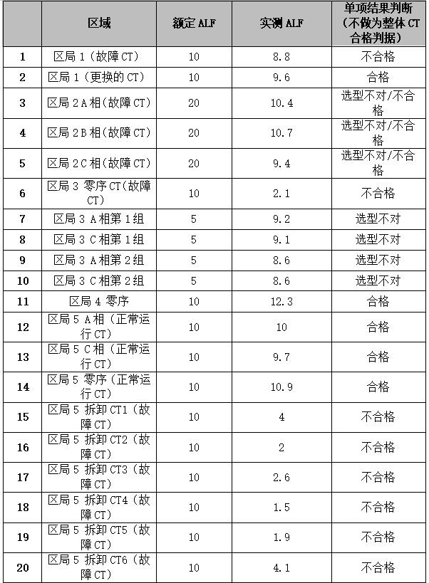1)CT準確限值系數(shù)ALF測試結(jié)果統(tǒng)計表 (根據(jù)要求CT的選型為10P10,判斷依據(jù):
