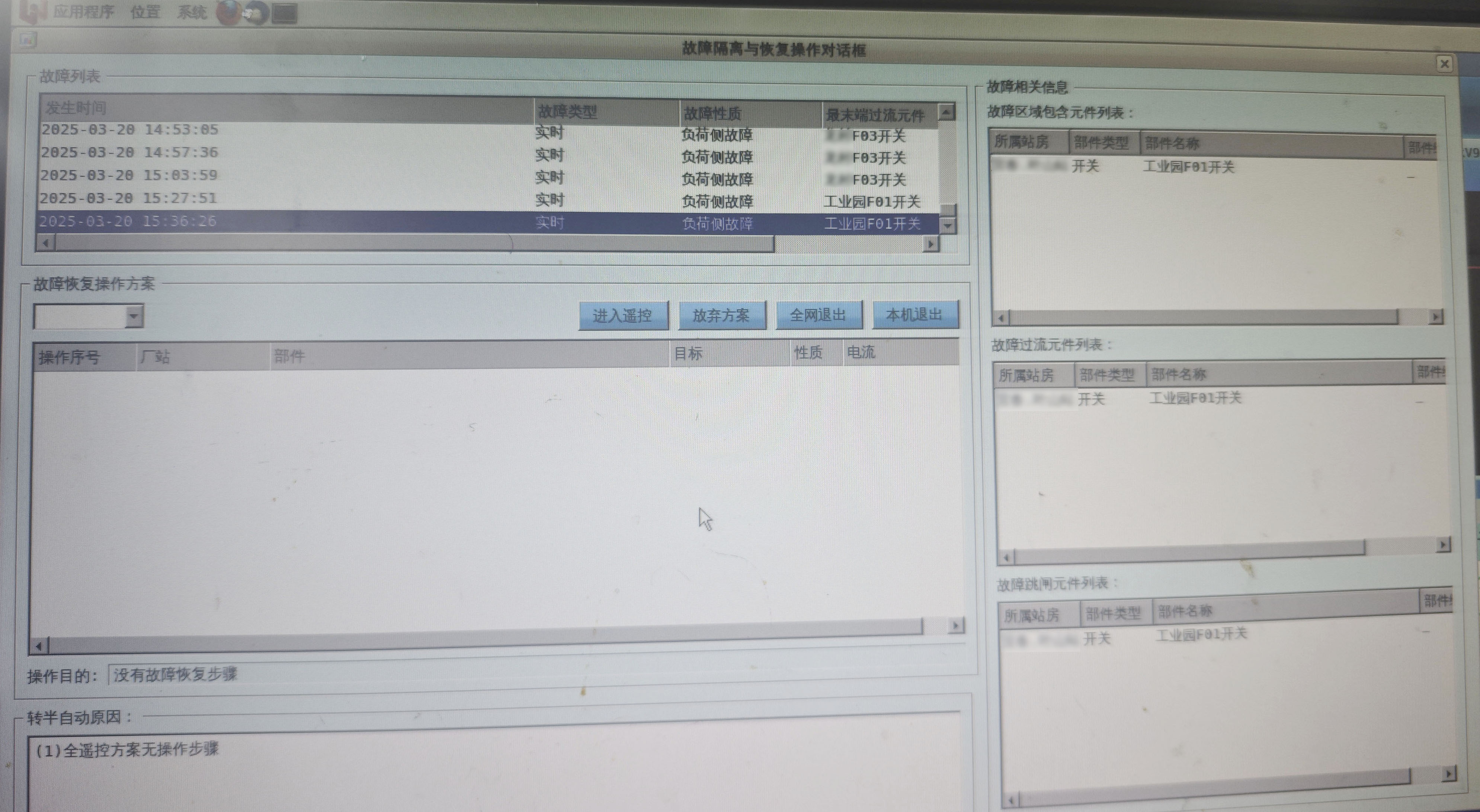 工業(yè)園F01開關(guān)保護(hù)分閘,重合與故障跳開,恢復(fù)供電方案為“無”。