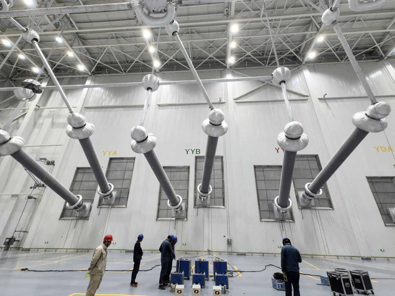 極高端閥側(cè) YY注流100A,網(wǎng)側(cè)感應(yīng)電流22A,YY方式中儀器只需N線接地排,合上閥廳地刀,儀器A / B / C相分別接對應(yīng)柱子即可形成回路。YY方式注流需要串聯(lián)電抗器,根據(jù)實際串入電抗器后的阻抗反推短路阻抗參數(shù),也可根據(jù)電抗器銘牌 , 加上 YY方式換流變阻抗 后計算 得出 。