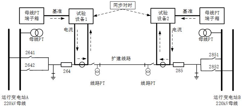線路改擴(kuò)建通常為兩側(cè)線路同時(shí)進(jìn)行,傳統(tǒng)方法通常為本側(cè)保護(hù)裝置自環(huán),單側(cè)加量進(jìn)行后備保護(hù)向量驗(yàn)證,難以進(jìn)行差動(dòng)保護(hù)向量驗(yàn)證。國網(wǎng)公司 Q/GDW 12690-2025 《負(fù)荷模擬式繼電保護(hù)向量檢查試驗(yàn)導(dǎo)則》明確提出了 AB 站線路差動(dòng)保護(hù)向量檢查方法。兩站均以系統(tǒng)電源為基準(zhǔn)(或采取對(duì)時(shí)同步),分別用試驗(yàn)設(shè)備模擬一次負(fù)荷電流流經(jīng)電流互感器,檢查線路差動(dòng)保護(hù)向量是否正確。